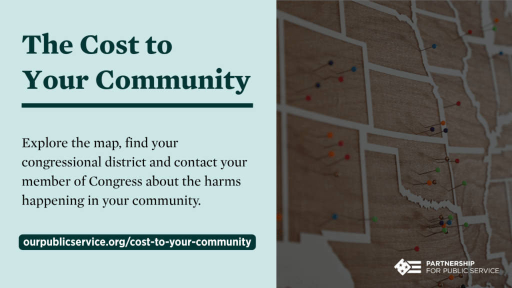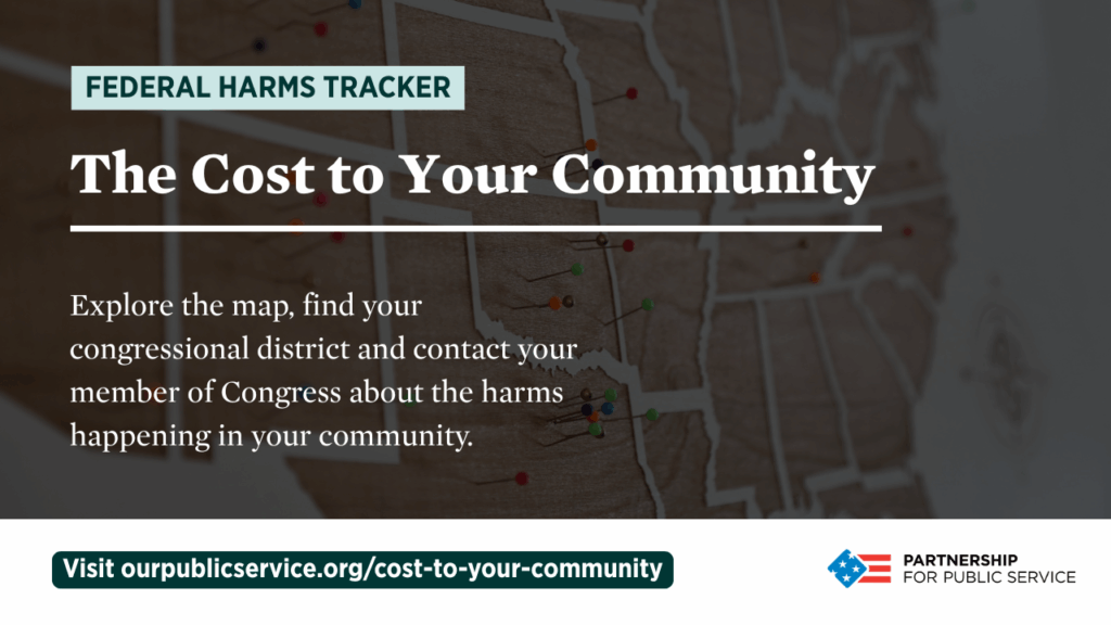 Communications Toolkit Federal Harms Tracker The Cost to Your Community COMMUNICATIONS Toolkit Back to Overview About the Partnership for Public Service The Partnership for Public Service is a nonpartisan, nonprofit organization that strives for a more effective government for the American people. We work across administrations and political parties to help federal agencies better deliver on their missions through improved leadership, workforce management, and organizational effectiveness. Learn more at dev.ourpublicservice.org. About the Cost to Your Community The Partnership for Public Service’s newest interactive map, The Cost to Your Community, is designed to show the federal government’s footprint across states, cities and communities nationwide, combining state- and congressional district-level data on federal personnel, funding and infrastructure to show how government resources are distributed around the country and how that presence is shifting amid unprecedented changes under the Trump administration. Marketing Sample newsletter blurb The Partnership for Public Service’s new interactive map, The Cost to Your Community, shows how federal workforce reductions, funding cuts and institutional changes are affecting communities nationwide. The map combines state and congressional-district level data and impact stories to show how government resources are distributed around the country and how that presence is shifting under the Trump administration. Learn how federal cuts are having a direct, tangible impact on Americans in [State] and contact your member of Congress about the harms happening in your community. Explore The Cost to Your Community here. Social Media Posts Click the ☰ icon right below this sentence or the > icon next to the posts to find the right social post for you. Email message template Subject line options: New federal stories map: The Cost to Your Community New tool for understanding the federal stories in your community New resource: The Cost to Your Community map Body message: Hi [First Name], I wanted to share a valuable resource that just launched: The Cost to Your Community, a new interactive map from the Partnership for Public Service. This is the third product in their Federal Harms Tracker series, and it is designed to show the federal government’s footprint and impact across states and communities nationwide. The map combines state- and congressional district-level data on federal personnel, funding and infrastructure to show how government resources are distributed around the country—and how that presence is shifting amid the changes happening under the Trump administration. What makes The Cost to Your Community particularly useful: It’s not just about numbers—every congressional district is paired with a story of harm or risk at the local level, and the map includes in-depth spotlight stories that highlight the direct effect on individuals and organizations in our communities. It shows the erosion of federal institutions and reveals how these often haphazard cuts are negatively affecting the American people in real and everyday ways. Check out the map here. I invite you to join me in sharing the impact and harms happening in [State] due to federal cuts. The Partnership is also collecting stories from communities, so if you know of impacts worth documenting, there’s a form here to share those stories. I hope you find The Cost to Your Community as useful as I have. Thank you, [Name of sender] DOwnloads Right click any of the image below and select “save image as.”