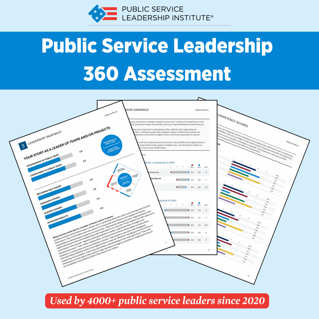 Tools Our tools draw on our experience working across federal agencies to strengthen public service leaders and help them address the unique challenges they face. 360 Assessment Developing leaders for today’s government When we released our Public Service Leadership Model in 2019, we emphasized the importance of effective government leaders in an increasingly complex and divided world. Today, good leaders matter more than ever. They must be stewards of the public trust with a passionate commitment to the public good, and they must demonstrate core values and critical competencies to achieve their agencies’ missions and desired impact. The Partnership’s Public Service Leadership 360 assessment is a comprehensive, multi-rater assessment tool that has been used by almost 4,000 government leaders since 2020. Leaders can use this 360 to evaluate their performance, assess their leadership progress and chart a course for self-improvement. It has been called “the roadmap to [my] leadership success” and has been used across our training programs, within Cabinet agencies and with leaders of all levels—from aspiring supervisors to senior executives. Recognizing that leadership competencies and feedback needs vary significantly between emerging and senior leaders, we offer two distinct and specialized versions of our 360 assessment. The Standard assessment provides leaders with a comprehensive evaluation of foundational public service leadership competencies, while the Senior Leader version addresses strategic competencies needed for executive-level impact. Both versions are designed to address the unique challenges and responsibilities at each respective leadership level in government. Our analysis of 360 data affirms that public servants are deeply committed to the public good, serve as stewards of the public’s trust and excel at collaboration. Our assessment also spotlights opportunities for continued development in competencies such as self-reflection, embracing risk and innovation. The Public Service Leadership Model and our 360 assessment set the standard for evaluating effective government leadership. The power of our 360 assessment tool—its reliability, validity and the impact it has on individual leaders across government—will help public servants cultivate stronger leadership skills and deliver mission-critical services for the American public. Interested in learning how the Public Service Leadership 360 can support your own leadership development? Contact training@dev.ourpublicservice.org for additional information. Email “I suffer from imposter syndrome and often doubt my leadership abilities, but the 360 evaluation increased my self-awareness and helped me to see myself as others see me—as a strong, action-oriented, innovative leader who gets results.” Learn more about our leadership development programs that include this 360 assessment: Excellence in Government Fellows Foundations in Public Service Leadership Leadership Excellence for Acquisition Professionals Case Studies The Public Service Leadership Model seeks to set the standard for government leadership, outlining the core values and competencies that federal employees must demonstrate to best serve the public. The following case studies highlight public servants who have activated the model’s core principles to solve big challenges, drive impact and strengthen our country. Thumbnail for Becoming Self-Aware Becoming Self-Aware How one public servant’s strong self-awareness helped create a more nuclear-secure world Read more Thumbnail for Engaging Others Engaging Others You can bank on it: How employee engagement helped the FDIC stabilize the nation’s financial system during the Great Recession Read more Thumbnail for Leading Change Leading Change From science to societal impact: How one public servant led the charge to make kidney disease a national health issue Read more Thumbnail for Achieving Results Achieving Results Putting the customer first: How Barbara C. Morton helped transform the way our government serves veterans Read more Thumbnail for Stewardship of Public Trust Stewardship of Public Trust The stewards of Medicare: How four public servants helped protect one of America’s signature health programs Read more Thumbnail for Commitment to Public Good Commitment to Public Good Francis Collins: A commitment to public good, public health and public service leadership Read more