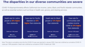 The covid19.ca.gov/equity dashboard was California’s first commitment to visualizing health disparities at the state level. It is fully accessible, translated in multiple languages and works on low-bandwidth phones.