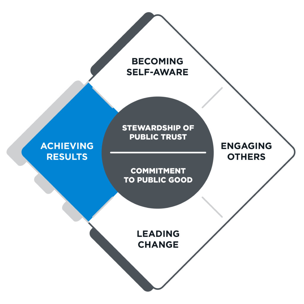 Achieving results means managing skillfully, thinking strategically and making good decisions that deliver measurable outcomes and improve the quality of life for the nation and the world. The five subcompetencies to achieving results include: